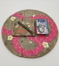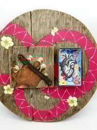 The wood...lid (?) used for this piece was found in a 100+ year old barn at a "cabin" we used to spend time at when my daughter was little. I always thought it looked like a shield, but have no idea what it was originally for. The barn was so old that anytime you went inside, you knew you were gambling with your life. There was a whole lot of goodies in there, I'm sure, but I never had the guts to go in too far to explore. I love the contrast between the roughness and weathered appearance of the wood and leather, and the softness of the flowers and the pink.